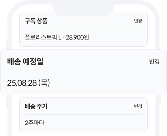 수령일 4일 전 배정된 품목을 알림톡으로 보내드려요. 구성이 마음에 들지 않으면, 수령일 1일 전 오전 8시까지 품목을 변경하거나 추가할 수 있어요.